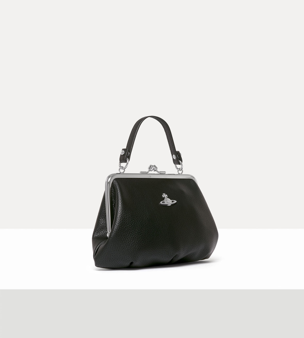 The Granny Frame purse features a polished metal framework, adorned with a secure kiss-lock clasp, recalling the designs of early 20th-century coin purses. The piece offers a soft PU leather finish with grained-effect embossing across the design, adorned with the house’s orb motif, symbolising tradition, and encircled by the celestial rings of Saturn, representing the future.